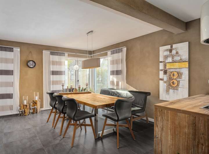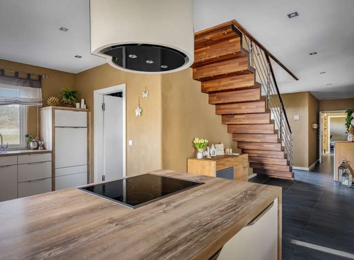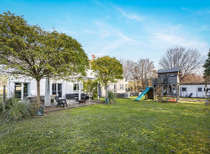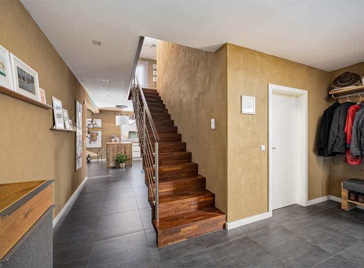 Im Erdgeschoss mit seinen ca. 136 m² bildet der offene Wohn- und Essbereich das Herzstück des Hauses. Hier können Sie mit Ihrer Familie gemütliche Stunden verbringen und von der Terrasse aus direkt in den weitläufigen Garten blicken – ein echtes Paradies für Kinder, das zum Spielen und Entspannen einlädt. Ein Schwedenofen sorgt in der kalten Jahreszeit für zusätzliche Wärme und Wohlfühlatmosphäre.