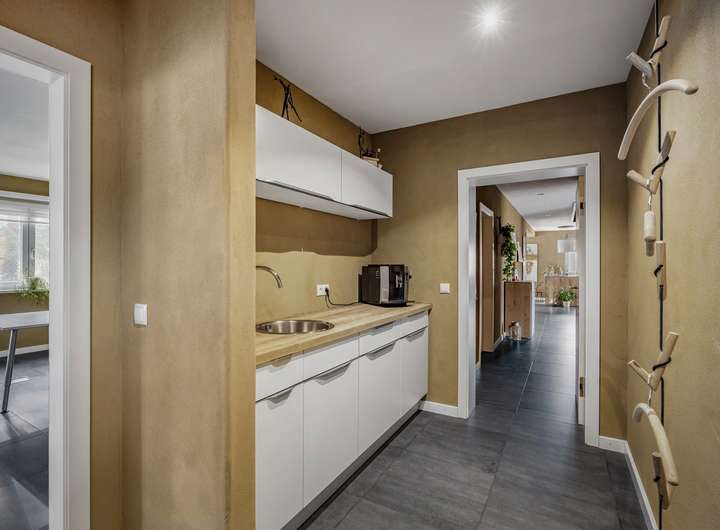 Besonders hervorzuheben ist der separate Bereich im Erdgeschoss, der derzeit als Büro genutzt wird. Dieser umfasst ca. 56 m² und bietet aktuell zwei Büroräume, ein Tageslicht-WC mit Waschbecken und Toilette sowie eine kleine Küchenzeile. Der Bereich könnte problemlos als Einliegerwohnung oder für Wohnen und Arbeiten unter einem Dach genutzt werden. Der Trakt verfügt über einen eigenen Eingang sowie einen direkten Zugang zum Wohnhaus. Diese flexible Nutzungsmöglichkeit macht das Haus zu einem idealen Objekt für Mehrgenerationenwohnen, eine Rückzugsmöglichkeit für Teenager oder sogar für die Vermietung einer Einliegerwohnung, die zur Deckung der monatlichen Kosten beitragen könnte.