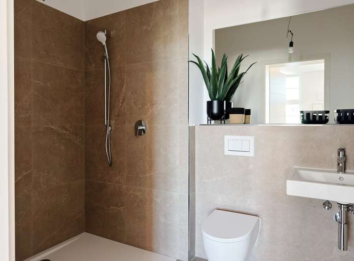 - Großformatige Wand- und Bodenfliesen in den Bädern