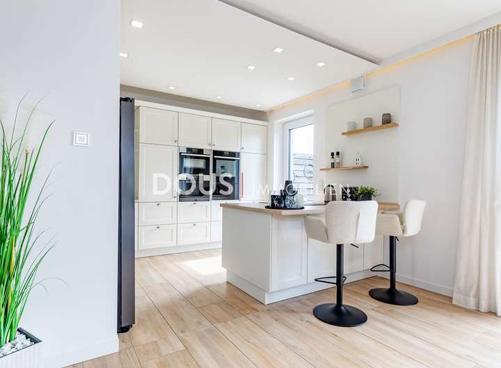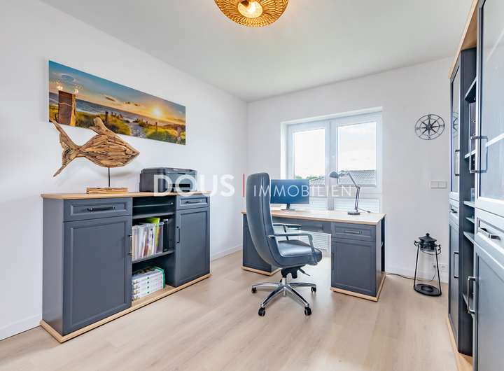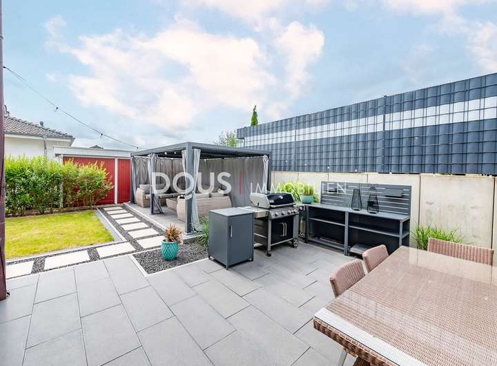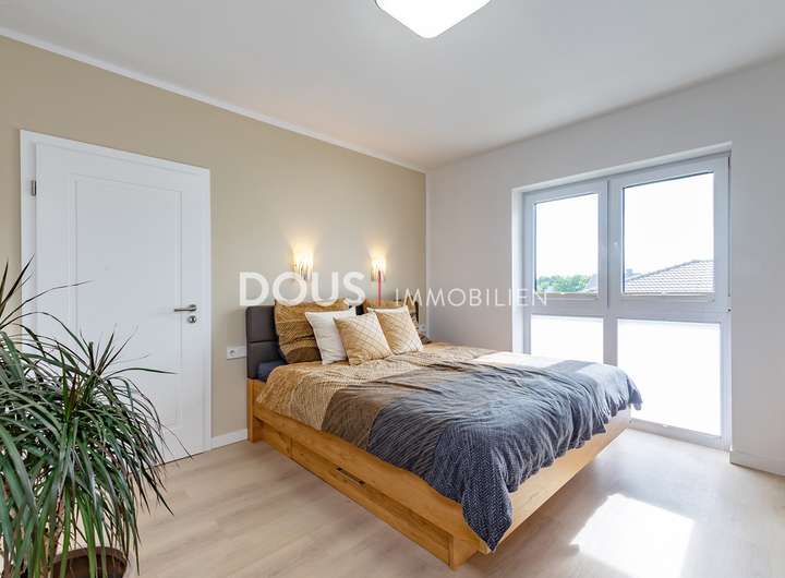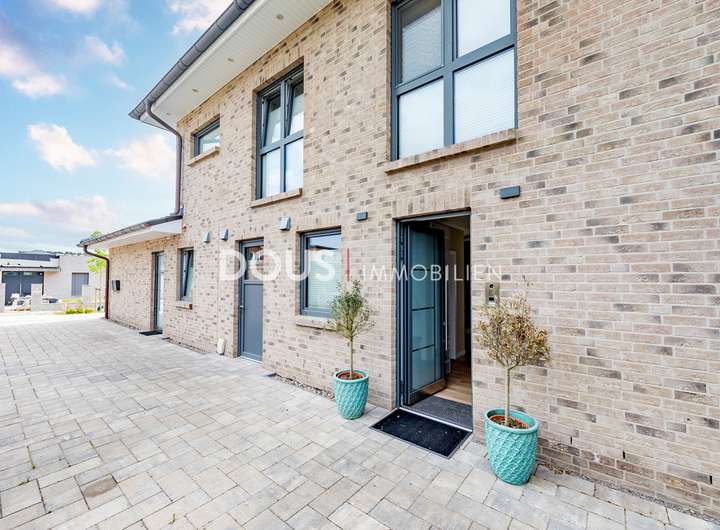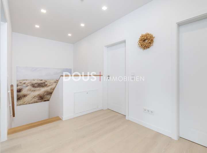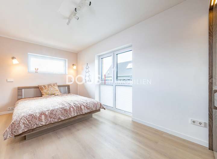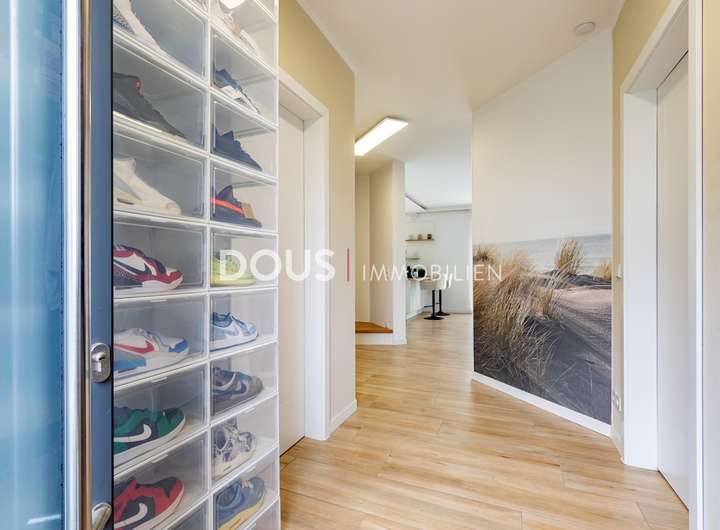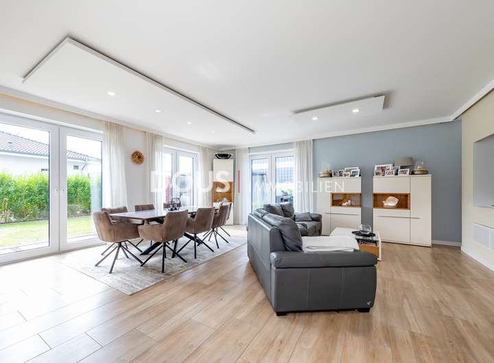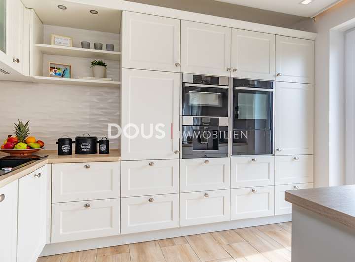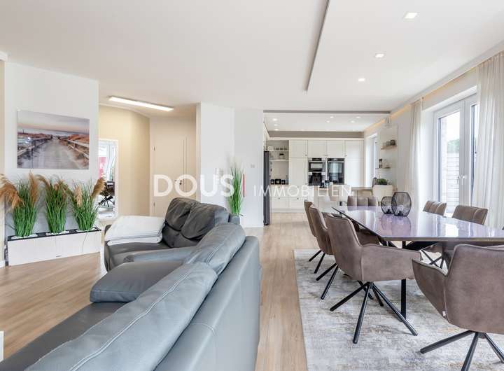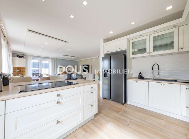 Über die offen gestaltete Diele gelangt man in das großzügige Wohnzimmer mit Wohnküche. Die moderne Küche im Landhausstil verfügt nicht nur über hochwertige Markengeräte wie von Nolte oder Neff, sondern auch über eine große Kochinsel mit versenkbarer Dunstabzugshaube. Eine kleine Frühstücksterrasse ist ebenfalls von der Küche aus erreichbar. Die große und uneinsehbare Terrasse hinter dem Haus lässt keine Wünsche offen. Hier wird gegrillt und gechillt, gelacht und gespielt.