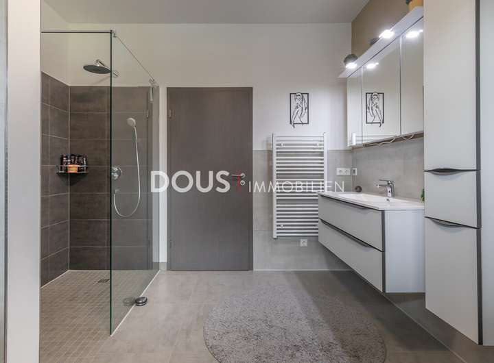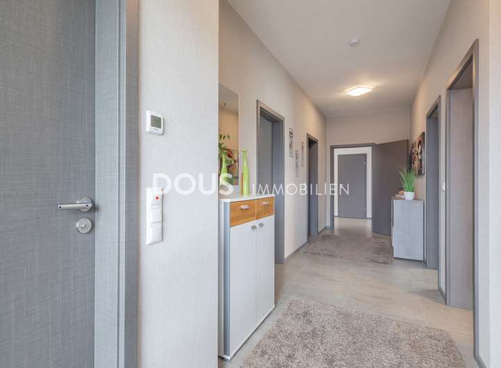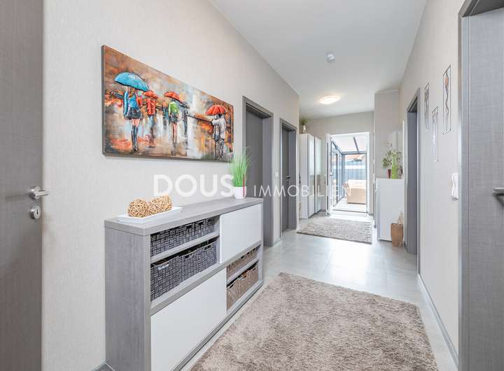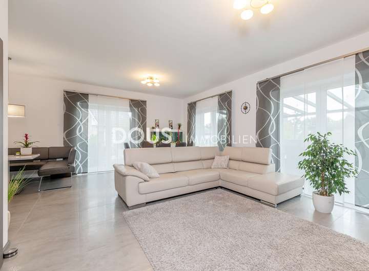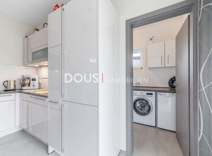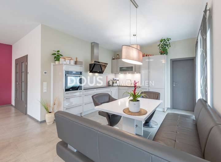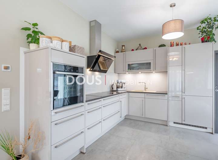 Der Eingangsbereich führt Sie in die helle und modern ausgestattete Küche, die mit hochwertigen Geräten und viel Arbeitsfläche überzeugt. Der offene Wohn- und Essbereich bietet viel Platz für gemeinsame Mahlzeiten und entspannte Stunden. Große Fensterfronten sorgen für eine freundliche, lichtdurchflutete Atmosphäre.