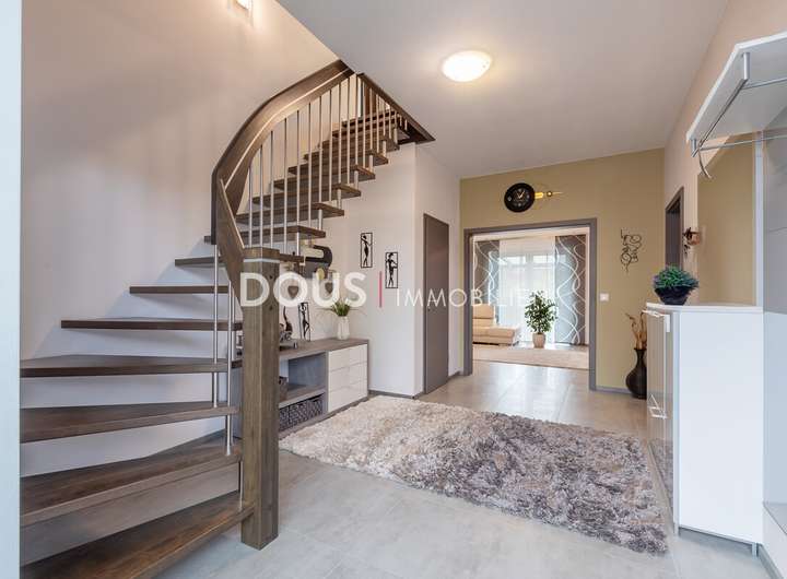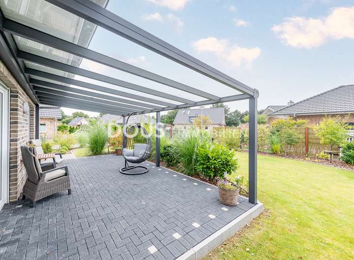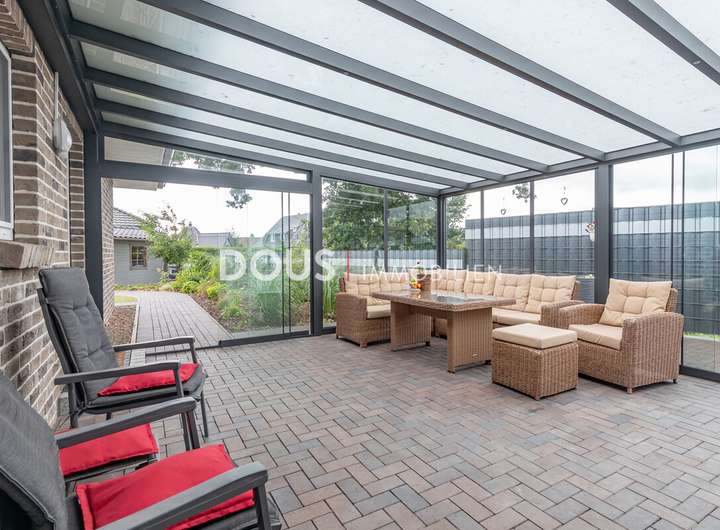 Auch im Außenbereich bietet das Haus zahlreiche Vorzüge: Ein Doppelcarport und zusätzliche Stellplätze im Freien gewährleisten ausreichend Platz für Fahrzeuge. Der gepflegte Garten wird durch eine Terrasse und einen Wintergarten ergänzt und schafft so zusätzlichen Wohnkomfort im Sommer wie im Winter. Gartengeräte und Werkzeuge können im praktischen Geräteschuppen untergebracht werden.