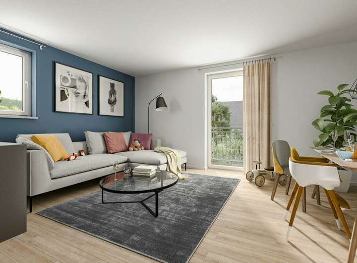 Auch im Obergeschoss wird moderner Wohnkomfort großgeschrieben. Während im geräumigen Wohnzimmer alle zusammenkommen, bieten drei weitere Zimmer einen individuellen Rückzugsort. Ausreichend Stauraum ist dank eines Abstellraums im Flur und einer Ankleide im Schlafzimmer gewährleistet.