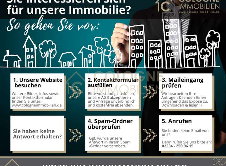 Rufen Sie uns an: 02234 – 250 96 15 oder schreiben Sie uns: info@cologneimmobilien.de Besuchen Sie uns auf: www.cologneimmobilien.de