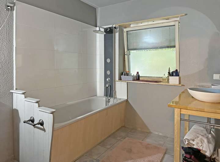 Im Erdgeschoss sind verschiedene Fliesen verlegt, die dem Haus einen funktionalen Charakter verleihen. Im Obergeschoss treffen praktische Fliesen auf einen ansprechenden Designbodenbelag, der bereits eine warme Wohnatmosphäre schafft. Das en suite-Bad im Erdgeschoss ist mit einer Badewanne ausgestattet und eignet sich ideal als persönlicher Rückzugsort. Im Dachgeschoss ergänzt ein weiteres Badezimmer mit Dusche das komfortable Raumangebot.