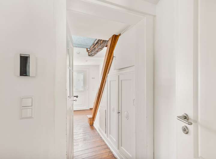 Der Wohnbereich überzeugt mit stilvollem Altbau-Charakter, großzügigen Räumen, sichtbaren Balken, Original-Wandvertäfelungen und teils Originaltüren und seiner hochwertigen Ausstattung: moderne Bäder, eine exklusive Küche, durchdachtes Raumkonzept sowie BUS-Leitungen als Vorbereitung für ein Smart-Home-System.