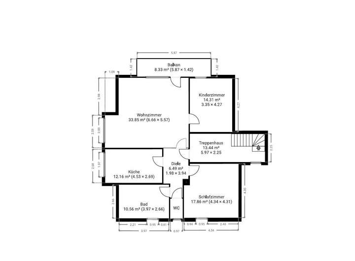 1. OG/DG: 3-Zimmer-Wohnung mit Diele, Küche, Bad, WC, HWR, Balkon ca. 100,77 m² Wohnfläche