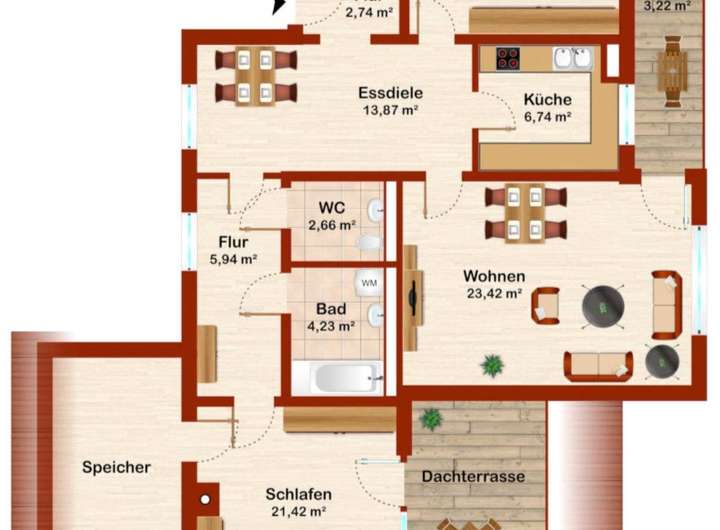- Die Möglichkeit eines Sonnensegels auf der Dachterasse.