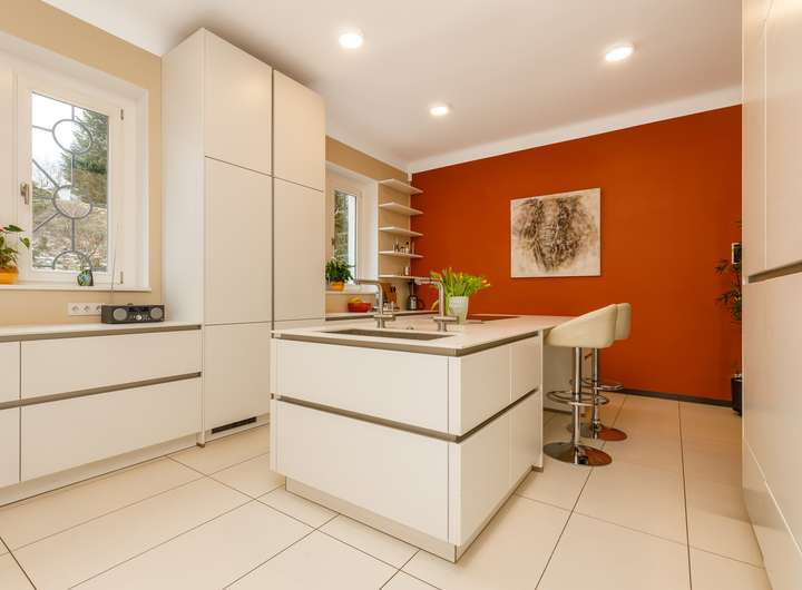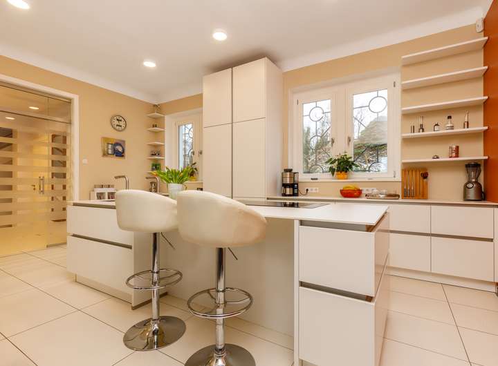 • Moderne Einbauküche mit Elektrogeräten sowie separater Vorbereitungsküche