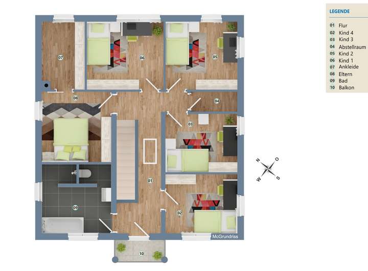 In dem ca. 95,00 m² großen Obergeschoss verteilt sich der Schlafbereich mit 5 Zimmern (eines davon mit Ankleidezimmer).