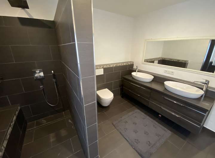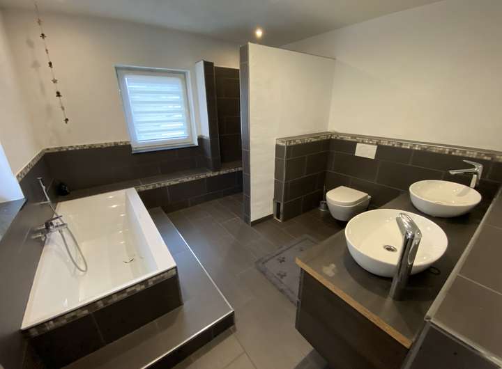 Das Badezimmer bietet eine moderne Badewanne für entspannte Stunden und eine großzügige Dusche für einen erfrischenden Start in den Tag.