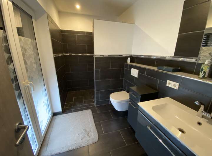 Linker Hand der Hauseingangstür befindet sich das praktische Gästebad mit bodenebener Dusche.