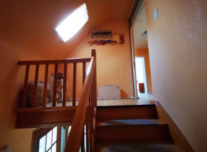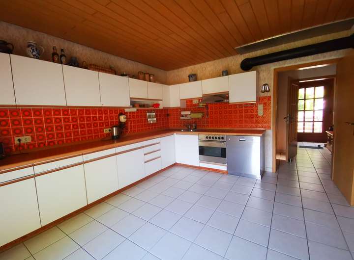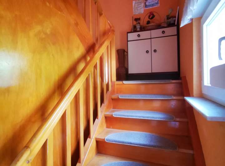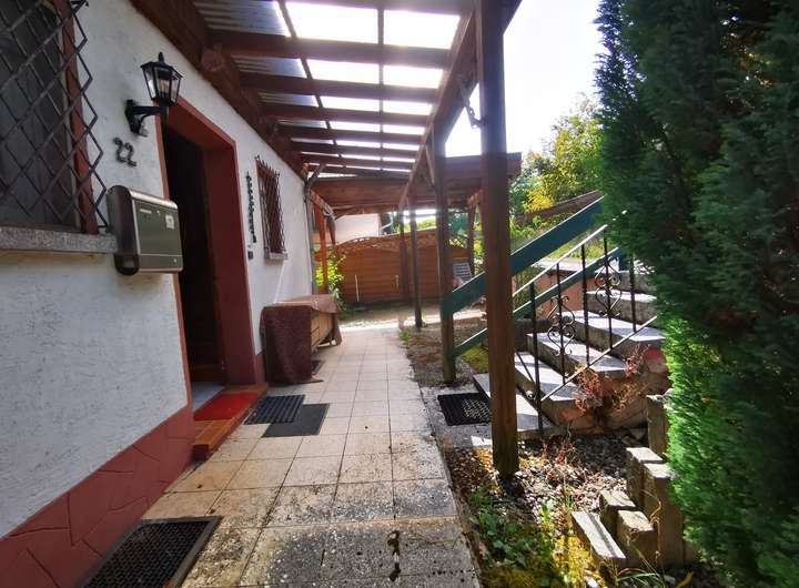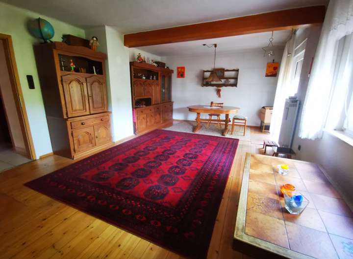 Das Haus selbst bietet auf 391 m² Grundstücksfläche im Erd- und Dachgeschoss mehrere Zimmer, die individuell nutzbar sind. Der Wohnbereich mit Kaminofen, die überdachte Terrasse und der Balkon schaffen ein besonderes Wohnambiente. Die Kellerbar erzählt von früheren geselligen Stunden und unterstreicht den Charakter des Hauses.