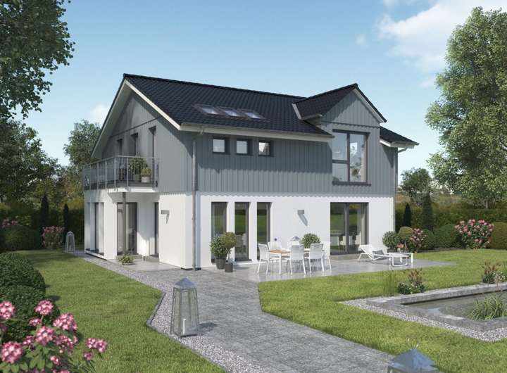 Das EVOLUTION 177 ist dank seiner hervorragenden Raumaufteilung genau das richtige Haus für größere Familien und kann auf Basis mehrerer vorgeplanter Varianten ganz individuell gestaltet werden. Als herrschaftliche Stadtvilla mit Walmdach zeigt es schon von außen wahre Größe. Außergewöhnlich große Fensterflächen und gleich zwei Wintergartenerker mit Balkon sorgen für fantastisch viel Licht im ganzen Haus und setzen gleichzeitig stilvolle Akzente.