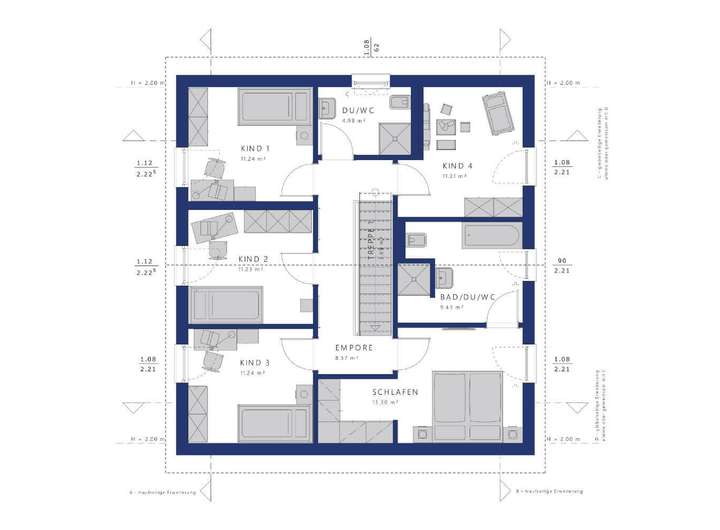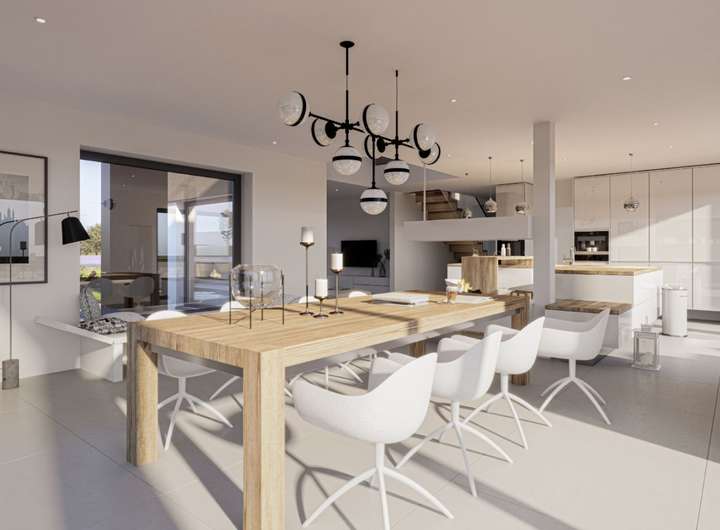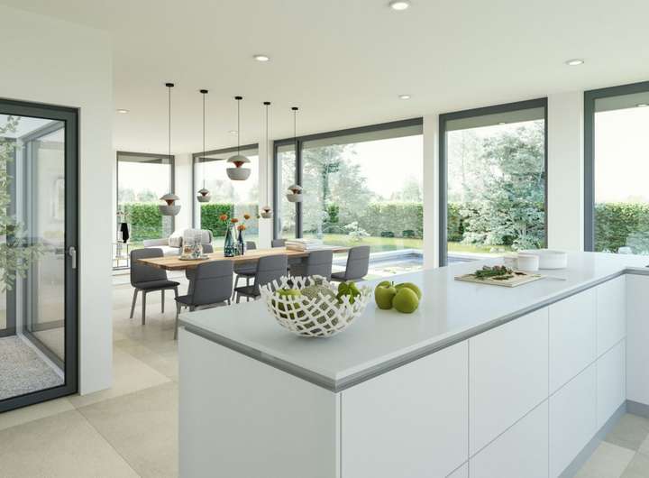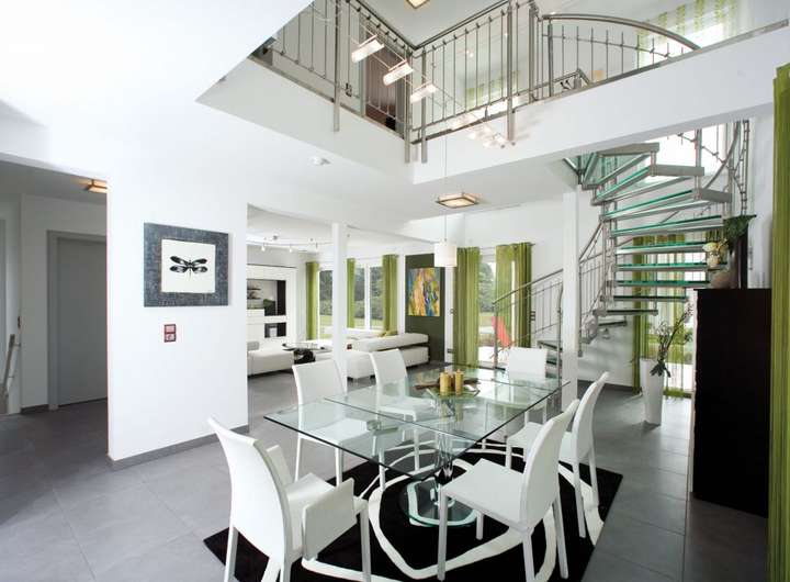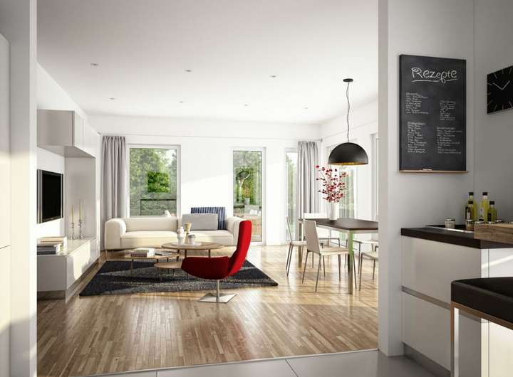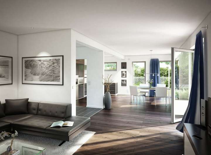 Im Inneren entpuppt sich das EVOLUTION 177 als Wohntraum für größere Familien: Bei rund 176 Quadratmetern bleibt kein Wunsch offen. Den Mittelpunkt aller gemeinschaftlichen Aktivitäten bildet der große, offene Wohn-Ess-Kochbereich im Erdgeschoss, der durch üppige Glasflächen in ein sonniges Ambiente getaucht wird. Ruhe und Privatsphäre für ein entspanntes Familienleben finden die Bewohner im Obergeschoss mit gleich fünf Schlafzimmern und zwei Bädern. Und sollte noch mehr Platz gewünscht sein, vergrößern Sie den Grundriss ganz einfach durch eine oder mehrere Wohnraumerweiterungen.