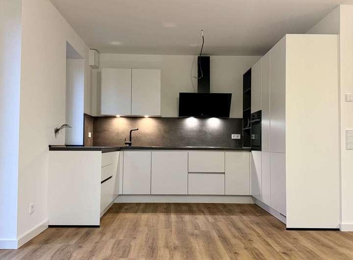 - Hochwertige und moderne Einbauküche mit hellgrauen Fronten
