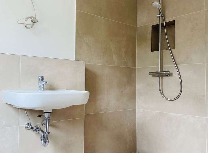 - Vollbad mit bodentiefer Dusche, Glasduschtrennwand, Spiegel & Handtuchheizkörper und Fenster (Lage: OG)