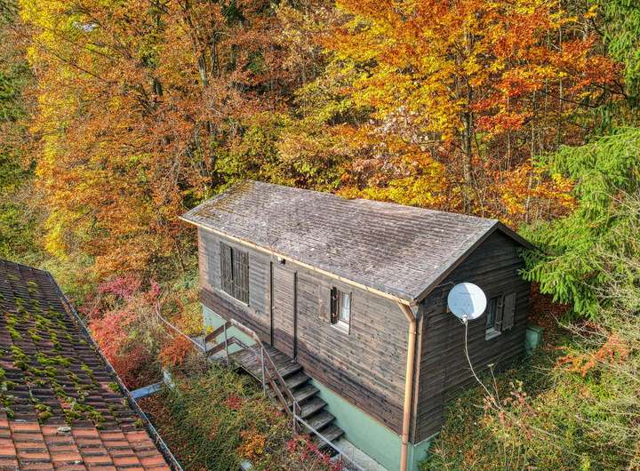 Oberhalb des hinteren Gebäudes (Haus B) liegt ein Gäste-Häuschen in Holzbauweise, mit etwa 23 m² Wohnfläche. Es verfügt über Strom- und Wasseranschluss und gliedert sich in einen kombinierten Wohn-/Schlafraum, eine kleine Küche mit Küchenzeile, sowie ein Bad – ideal für Besucher, Feriengäste oder als ruhiger Arbeits- und Rückzugsort.