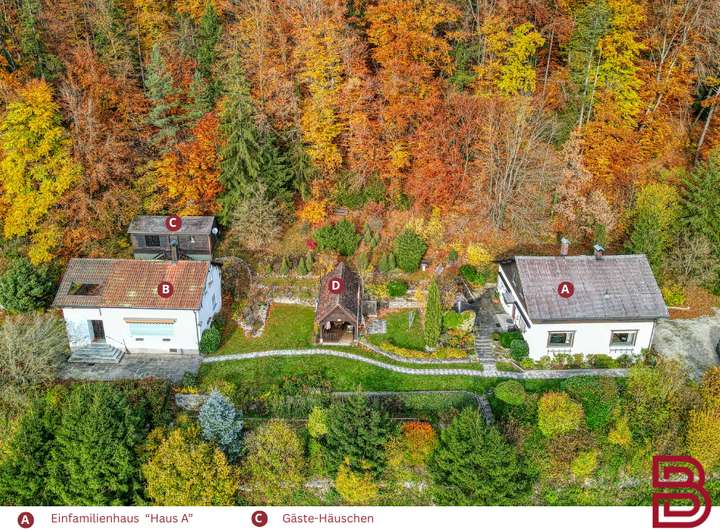Dieses außergewöhnliche Anwesen in erhöhter Alleinlage oberhalb von Riedenburg bietet eine seltene Kombination aus Natur, Privatsphäre und vielseitigen Nutzungsmöglichkeiten. Zum Gesamtbesitz gehören zwei Einfamilienhäuser in Massivbauweise, ein separates Gäste-Häuschen, sowie ein rund 18.000 m² großer, direkt angrenzender Wald – ein besonderes Highlight für Naturliebhaber, Familien oder Ruhesuchende.
