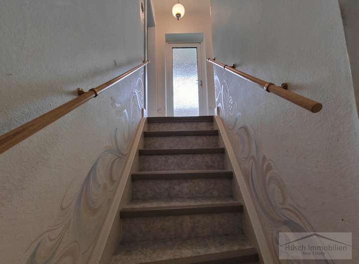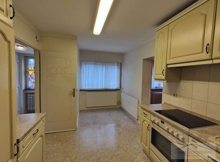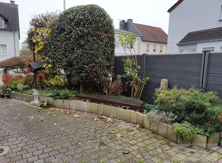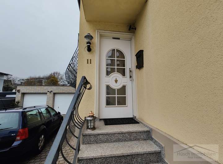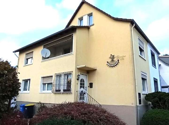 Diese Doppelhaushälfte befindet sich im Ortskern von Niedernhausen und verfügt über einen kleinen Vorgarten sowie eine Einfahrt, die in einen großzügigen Hof mit Zugang zu zwei Garagen führt.