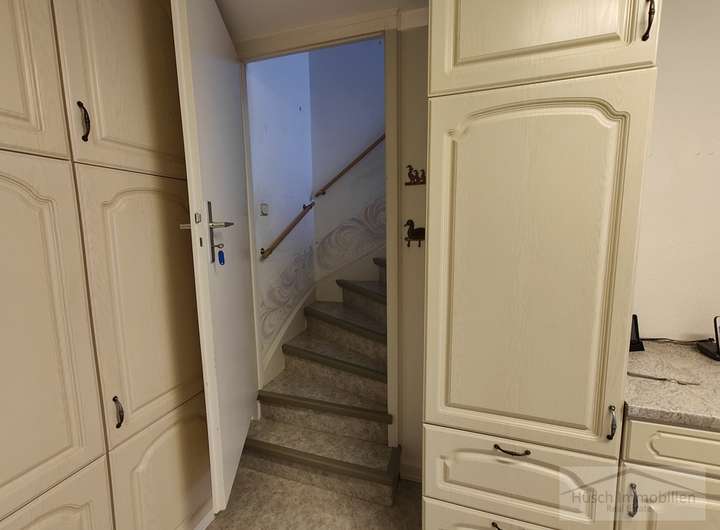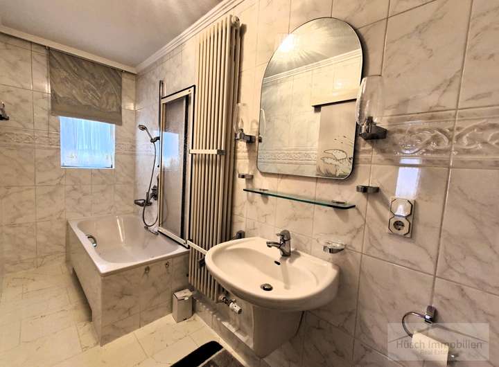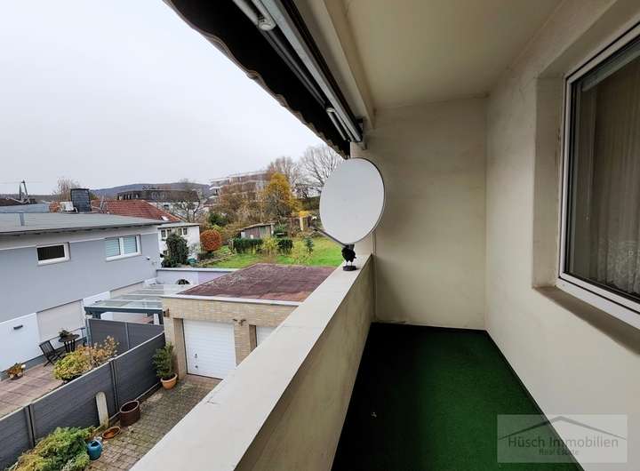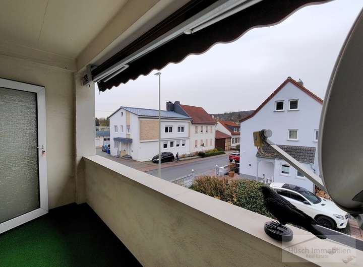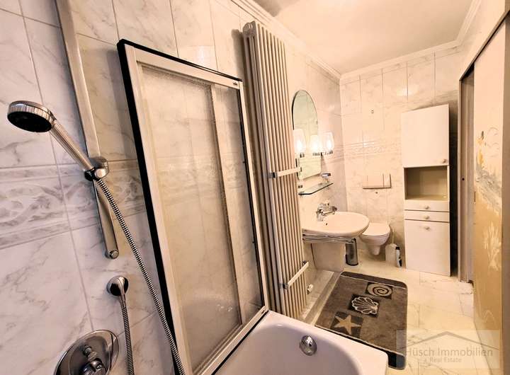 Von der Küche führt eine Treppe in das erste Obergeschoss. Links liegt ein weiteres gut geschnittenes Zimmer. Rechts befindet sich zunächst ein Durchgangszimmer, das sich gut als Garderobenraum nutzen lässt. Daran schließt sich das Schlafzimmer an, das einen direkten Zugang zum Badezimmer bietet. Das Bad ist mit Badewanne, WC und Waschbecken ausgestattet. Vom Flur aus gelangt man außerdem auf den vollständig überdachten Balkon, der eine angenehme Größe besitzt und mit einer Markise ausgestattet ist.