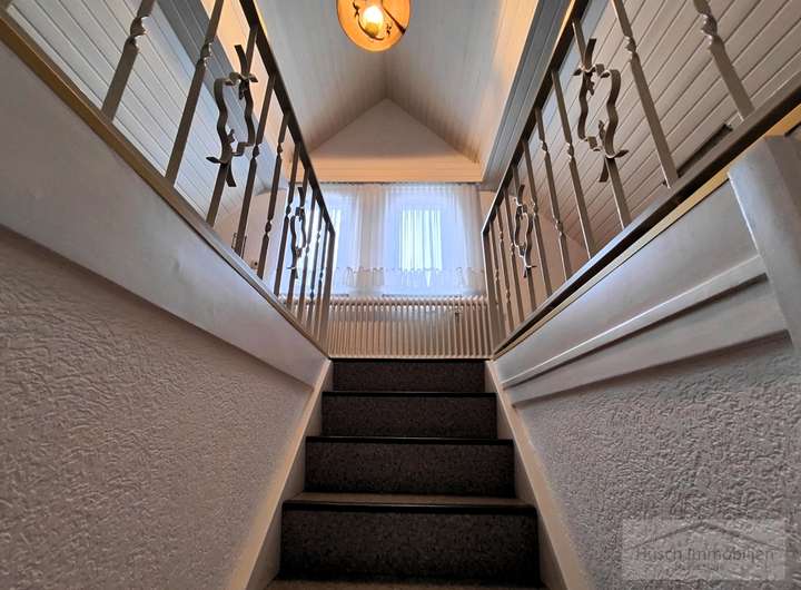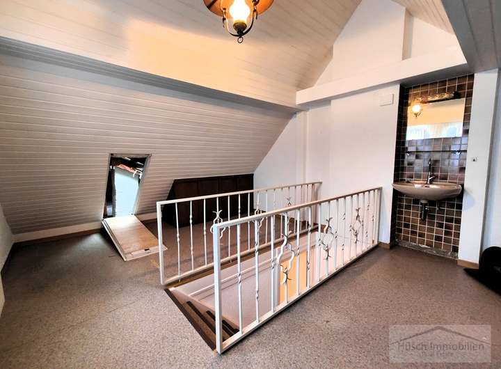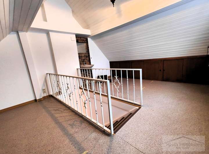 Über das Durchgangszimmer führt eine weitere Treppe in das Dachgeschoss, wo sich ein zusätzliches Zimmer befindet – ideal beispielsweise als Kinderzimmer.