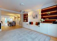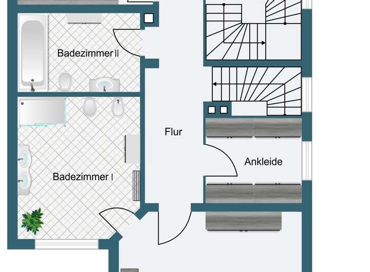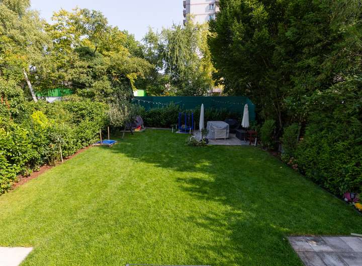 Eine geschmackvolle Holztreppe im Flur verbindet das Erdgeschoss mit dem ersten Obergeschoss und vereint beide Etagen zu einem großzügigen Wohnensemble. Hier erwarten Sie zwei helle Kinderzimmer, ein modernes Badezimmer mit ausgewählten Materialien sowie eine separate Ankleide. Das großzügige Schlafzimmer verfügt über bodentiefe Fenster und ein komfortables Bad en Suite. Durchgängig verlegtes Fischgrätparkett sowie ein praktischer Wäscheabwurf in das Untergeschoss unterstreichen den hohen Wohnkomfort.