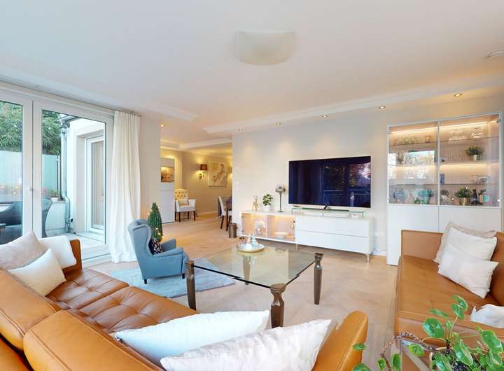 Über den hellen, gepflegten Hausflur gelangen Sie zu den Wohneinheiten im Erdgeschoss, im zweiten Obergeschoss sowie im dritten Obergeschoss/Spitzboden. Im Erdgeschoss empfängt Sie ein elegantes Entrée, das harmonisch in den weitläufigen Wohnbereich übergeht. Dieser präsentiert sich großzügig, lichtdurchflutet und hochwertig ausgestattet; die moderne, exklusive Einbauküche fügt sich fließend an. Große Fensterflächen sowie der direkte Zugang zur Terrasse und in den Garten schaffen ein offenes, einladendes Raumgefühl. Auf rund 90 m² gehen Küche, Essplatz und Wohnbereich ineinander über. Ein besonderes Highlight bildet das seltene Versailles-Parkett, das dem Raum eine edle architektonische Rahmung verleiht. Ein modernes Gäste-WC ergänzt diese Ebene.