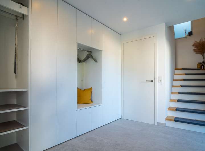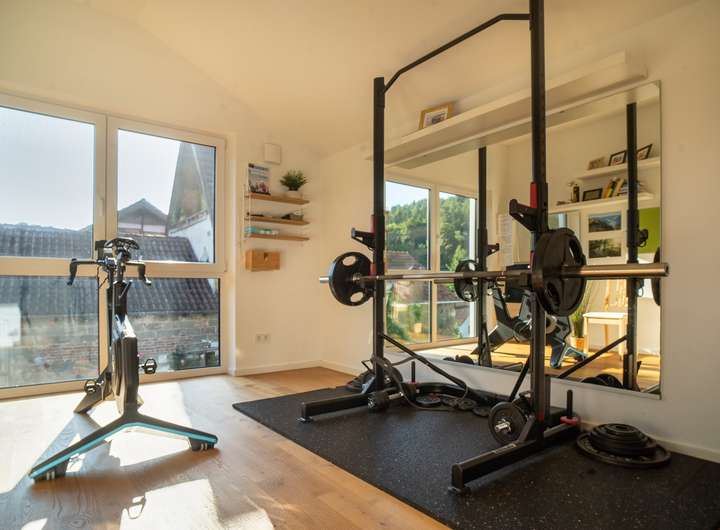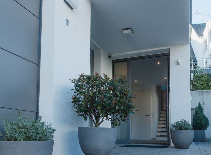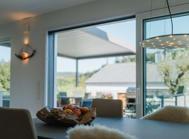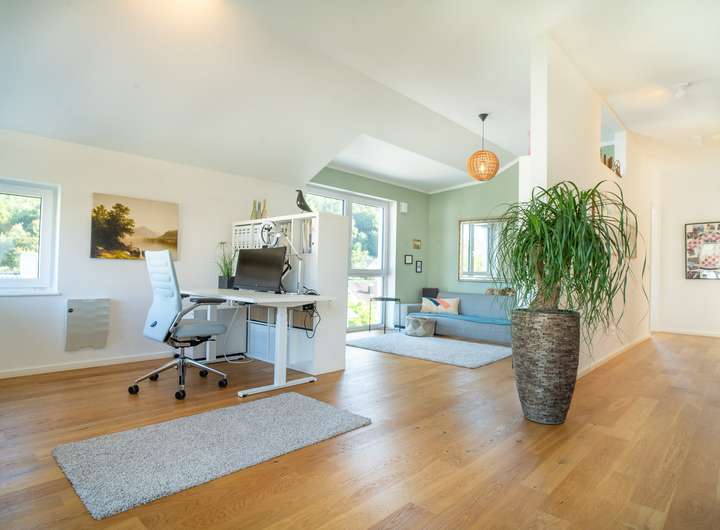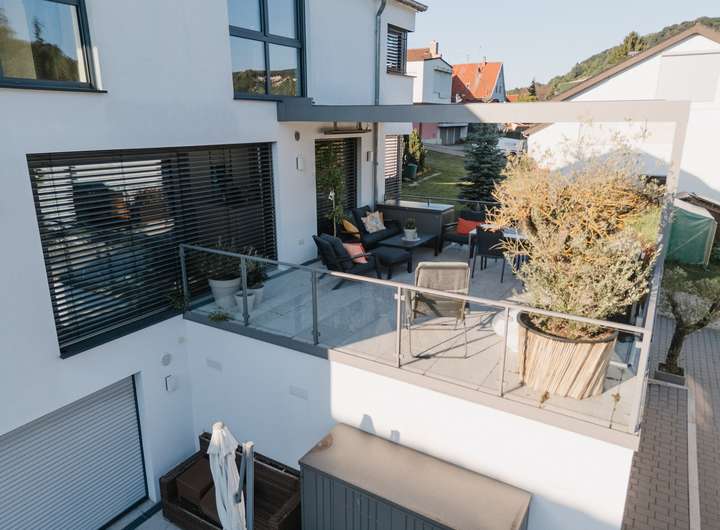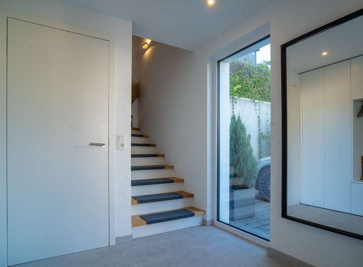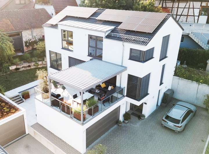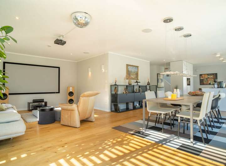 Bäder mit hygrometergesteuerter Lüftung. Elektrische Rolläden und Jalousien. Doppelgarage mit el. Rolltor sowie 5 weitere angelegte Stellplätze. Fotovoltaikanlage. Terrasse mit steuerbarer Bedachung. Außensauna im Garten. Glasfaseranschluss 1000mbit/s.