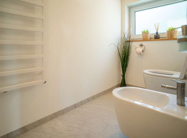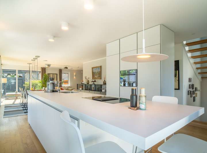 Wertvolle Böden und Fliesen. Höhere Wohnräume und Türhöhen in allen Geschossen. Hochwertige bulthaup-Küche (Neupreis ca. 50.000,-). Fußbodenheizung. Dezentrale Lüftungsanlage mit Wärmerückgewinnung (auch Einlieger). Wäscheabwurf vom Bad zu WM im HWR.