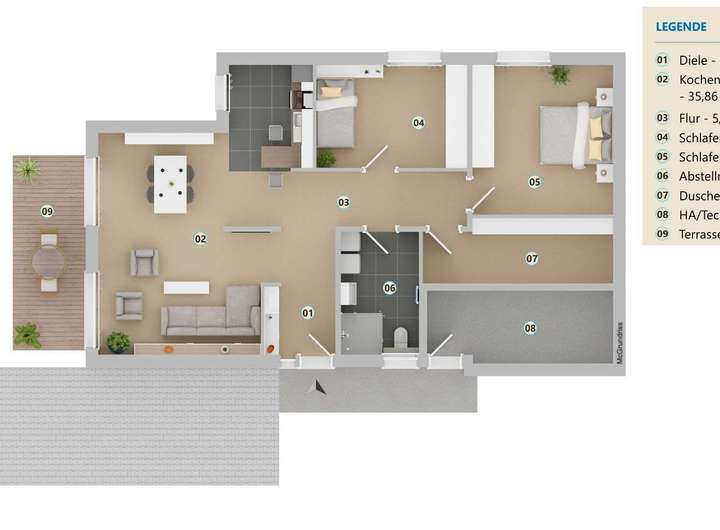 Außenbereich: Für alle Bewohner zugänglich befindet sich ein Technikraum, der nicht als Wohnraum zählt, aber praktisch genutzt werden kann.