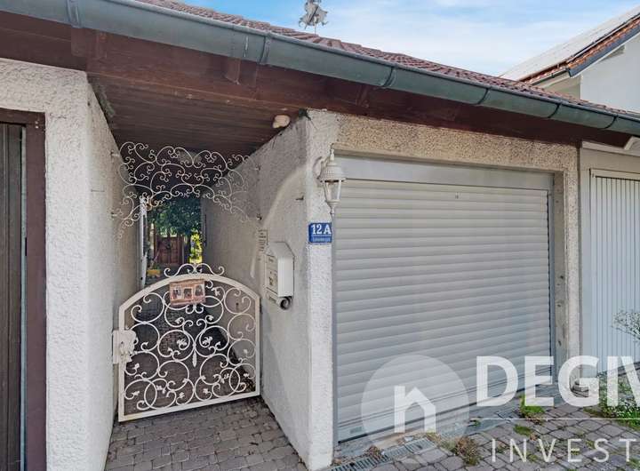 Ein Garage mit elektrischem Garagentor sowie ein angebauter Müll- und Geräteschuppen gehören zum Anwesen. In der Garage befindet sich ein Speicher als Lagerplatz. Zusätzlich gibt es einen Stellplatz.