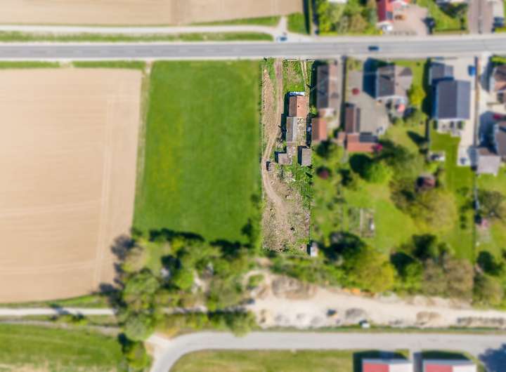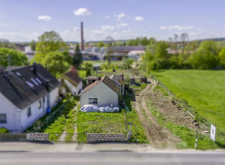 Entlang der westlichen Grundstücksgrenze verläuft ein ehemaliger Bachlauf, der das Areal vom angrenzenden Industriegebiet trennt. Diese natürliche Begrenzung sorgt für Privatsphäre und schafft zugleich eine harmonische Verbindung zwischen der gewerblichen Umgebung und der Natur.