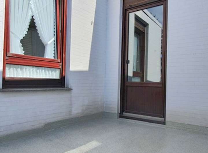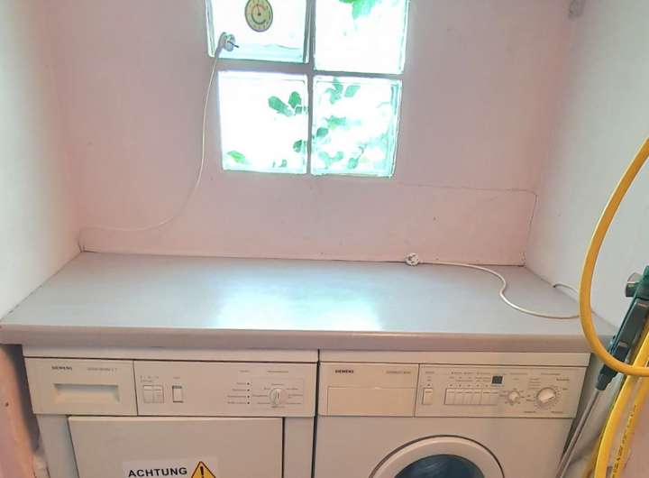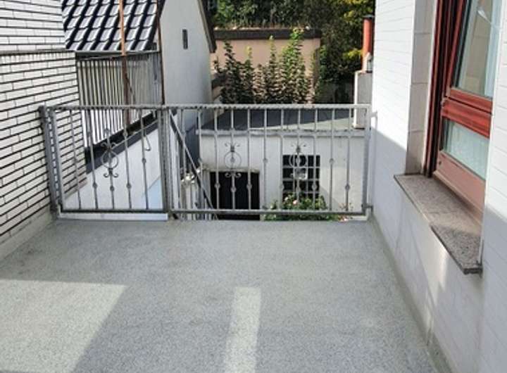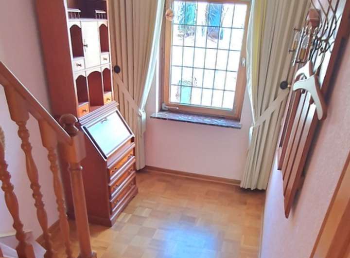 Durch die Windfangtür betreten sie den Flur des Hauses. Von hier gelangen sie in den zweiten Raum und das angrenzende Voll-Bad, in den Teilkeller, sowie in die erste Etage. Dort befindet sich auch die Küche, ein weiteres WC und das große Wohnzimmer mit angrenzender Dachterrasse. Von der Dachterrasse führt eine großzügige Treppe nach unten in den Hofgarten, wo sich – neben einer überdachten Terrasse - 2 weitere Nebengebäude befinden. Hier ist Platz für Waschmaschine, Trockner, die Ölheizung (Buderus - 1996), 2 Öltanks, Gartengeräte und vieles mehr. Mit dem Gartenabfall, Fahrrädern,, etc. können sie über die Gemeinschaftswege auch wieder zur Straße gelangen, ohne durch das Haus zu gehen (s. Lageplan).