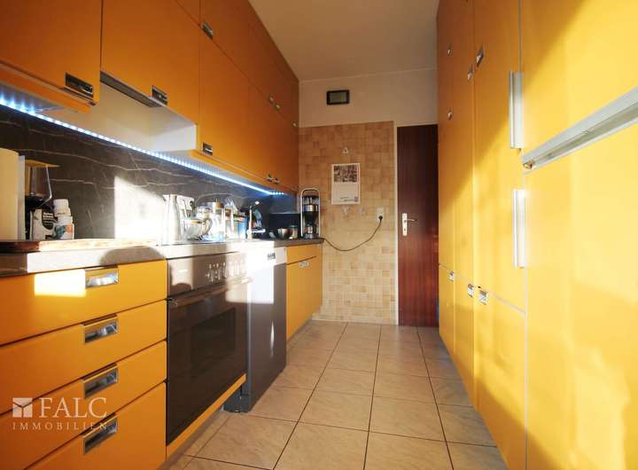 Angrenzend an den Wohnbereich befindet sich die funktional gestaltete Küche mit modernen Geräten und viel Stauraum, die ausreichend Platz für kulinarische Experimente bietet.