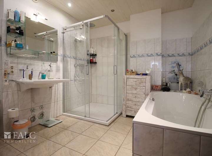 Das Badezimmer ist mit Dusche, Badewanne und WC ausgestattet und bietet somit alle Annehmlichkeiten für den täglichen Komfort. Zusätzlich gibt es ein separates Gäste-WC, das den Komfort für Besucher erhöht.