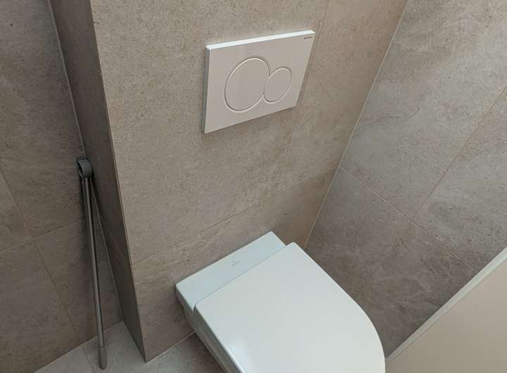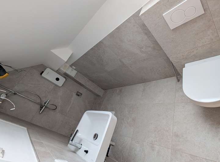 - Bad Beige gefliest mit großer Dusche/Duschkabine (Villeroy & Boch)