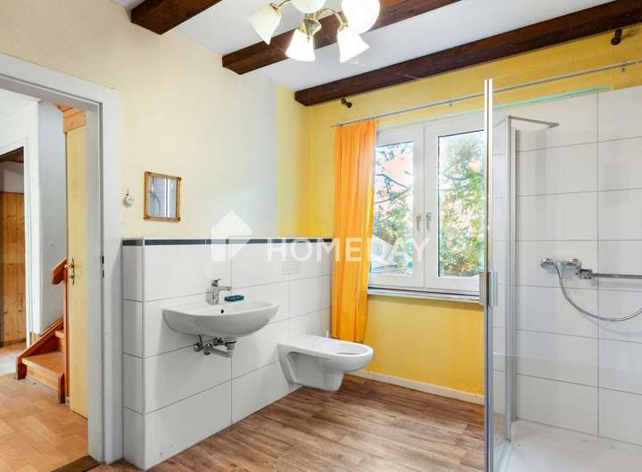Bereits beim Betreten empfängt das Haus mit einer angenehmen, wohnlichen Atmosphäre. Im Erdgeschoss befinden sich das gemütliche Wohnzimmer und das angrenzende Esszimmer, das mit einem schönen Kachelofen ausgestattet ist und so an kalten Tagen für behagliche Wärme sorgt. Die Küche ist funktional geschnitten und bietet ausreichend Platz für eine moderne Küchengestaltung nach individuellen Vorstellungen. Ein im Jahr 2021 nachträglich eingebautes Tageslichtbad mit ebenerdiger, barrierefreier Dusche bietet zusätzlichen Komfort im Alltag. Das Bad wurde so konzipiert, dass es bei Bedarf unkompliziert zurückgebaut oder individuell umgestaltet werden kann.