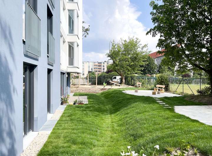 Um das Gebäude herum erstrecken sich Erholungs- und Spielflächen die allen Bewohnerinnen und Bewohnern frei zugänglich sind. Auf dem Areal gibt es außerdem 33 Fahrradstellplätze.