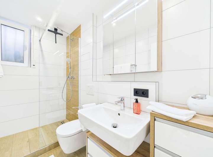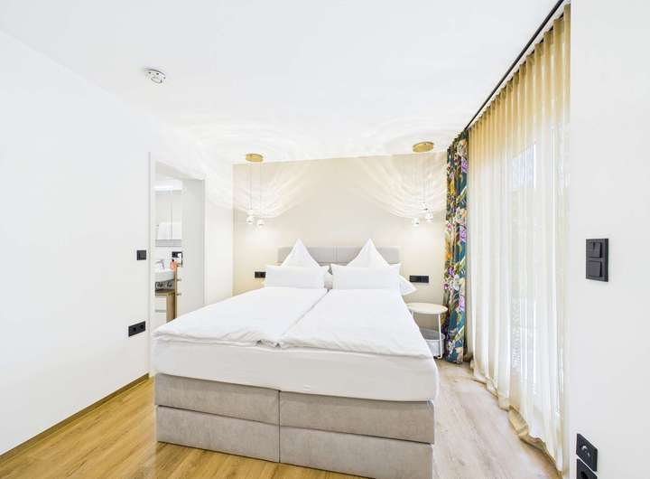 Das Schlafzimmer ist mit einem komfortablen Boxspringbett und einem großzügigen Kleiderschrank ausgestattet. Zusätzlich gibt es hier einen zweiten Zugang zur Terrasse. Das moderne Tageslichtbad bietet eine große Dusche. In einem separaten Kellerraum befindet sich ein Waschtrockner exklusiv für diese Wohnung.