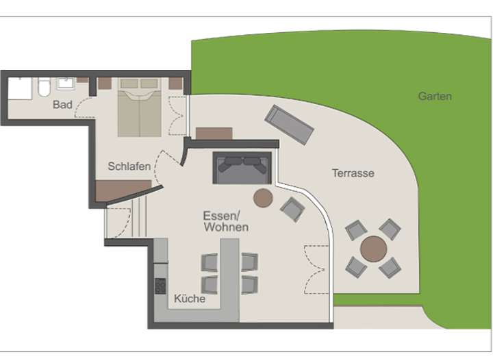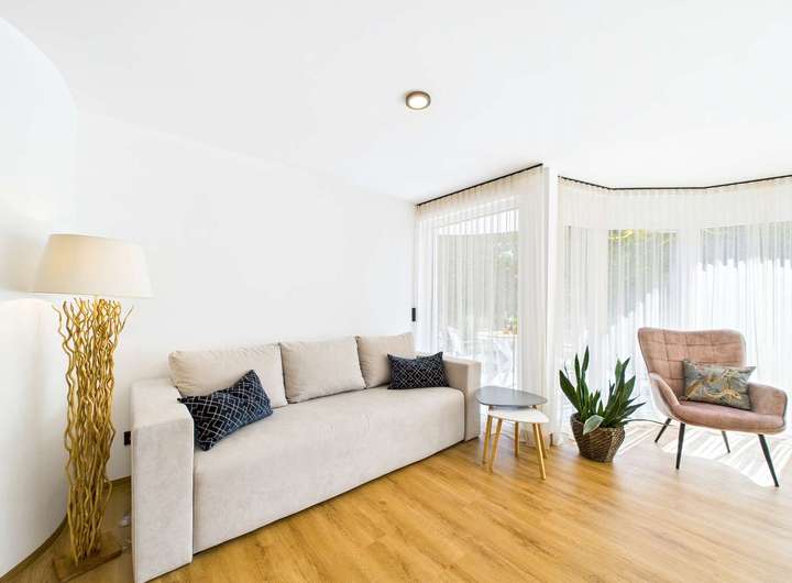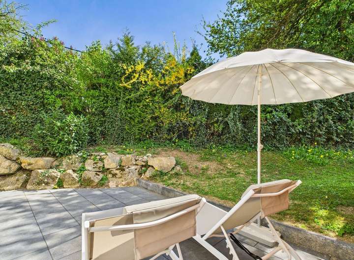 Der helle Wohn- und Essbereich verfügt über eine voll ausgestattete Küche, bequeme Sitzmöbel und den direkten Zugang zur eigenen Terrasse mit kleinem, gepflegtem Garten. Ein idealer Rückzugsort nach einem intensiven Arbeitstag.