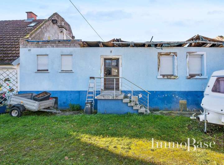 Auf dem vorderen Grundstücksbereich befindet sich der Altbestand (Brandruine) des Einfamilienhauses, welches ursprünglich mit etwa 130 m² Wohnfläche erbaut wurde.
