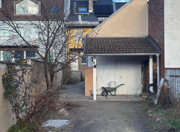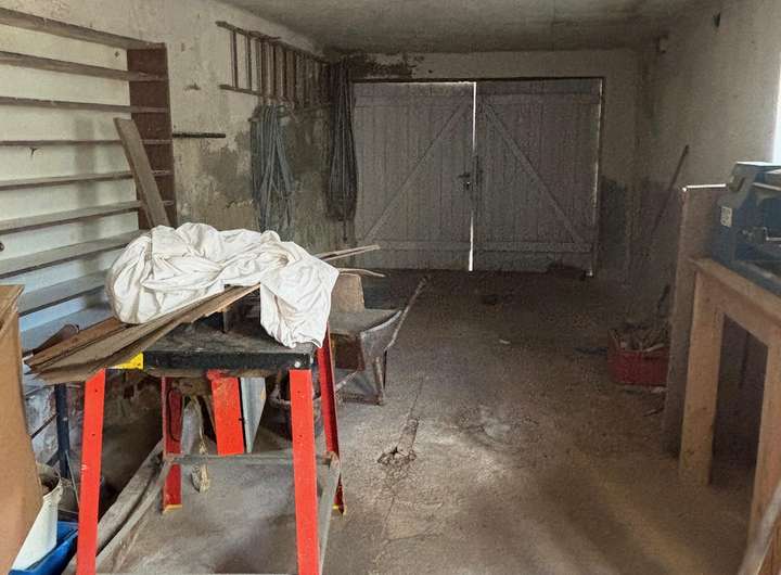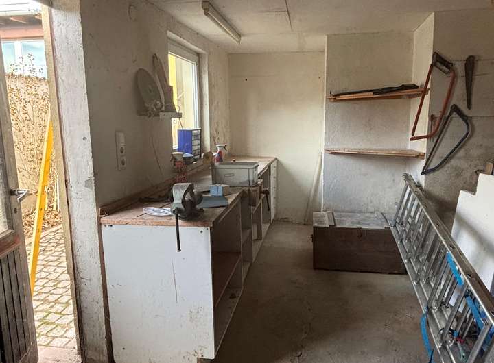 Die Garage mit angrenzender kleiner Werkstatt bietet Platz für ein Auto, dazu können Sie ein weiteres Fahrzeug bequem in der Grundstückseinfahrt abstellen.
