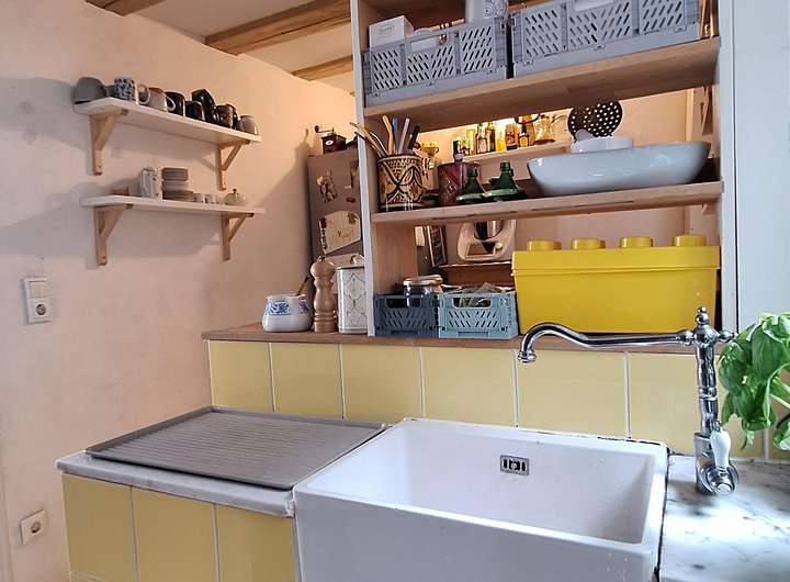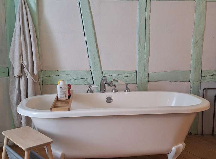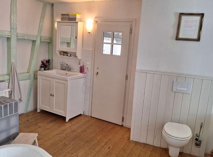 • Historisches Fachwerk mit sichtbaren Holzbalken und teils originalen historischen Fliesen