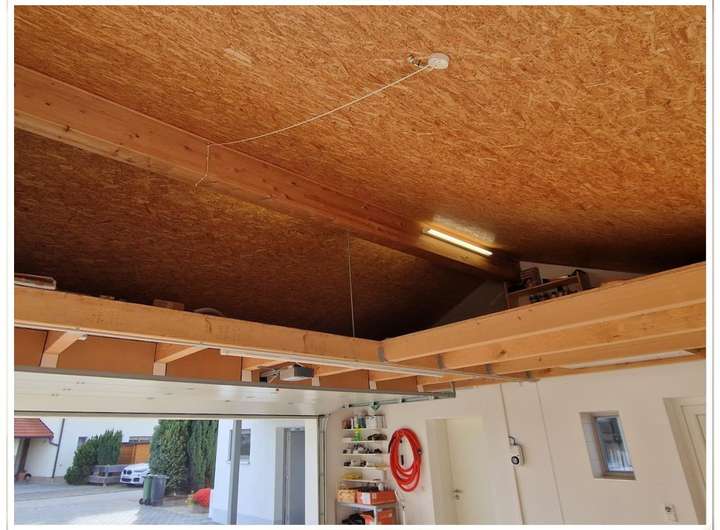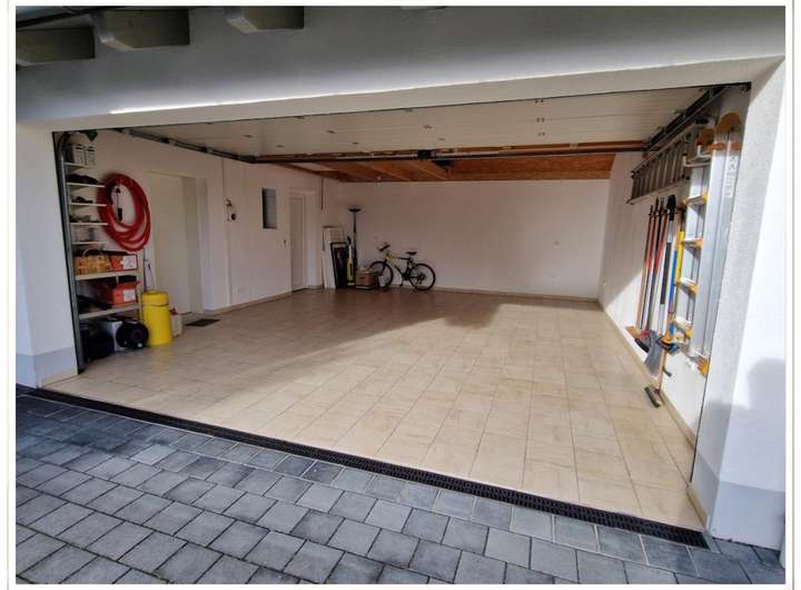 Doppelgarage, 41 m², mit elektrisch bedienbarem Tor (auch mit Fernsteuerung), direktem Hauszugang und Tür zum Garten;