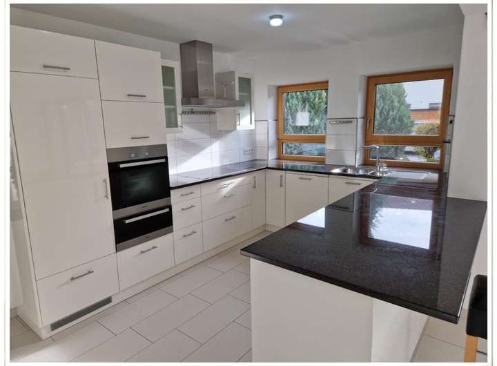 Exzellent ausgestattete Küche mit Granit-Arbeitsplatten in edlem anthrazit;