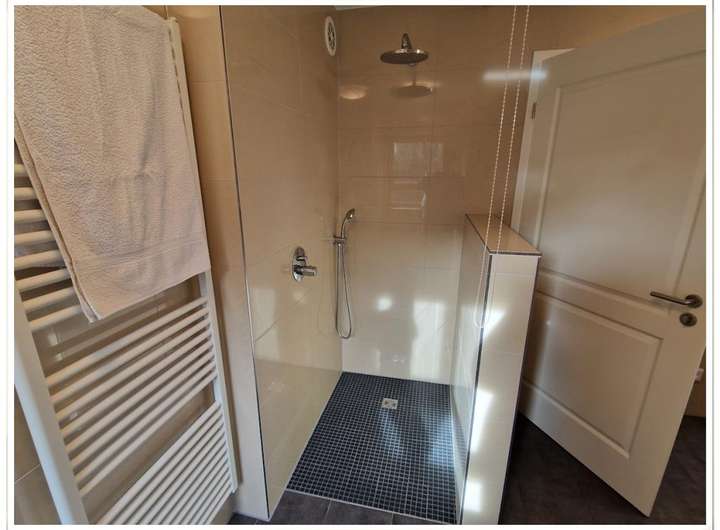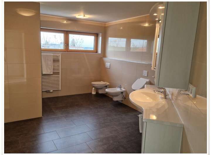 Großes 'Wohlfühlbad' im 1.OG, mit bodengleicher Dusche, Waschbecken, WC, Urinal und Bidet, sowie Fenster; es besteht die Möglichkeit, eine Badewanne einzubauen;