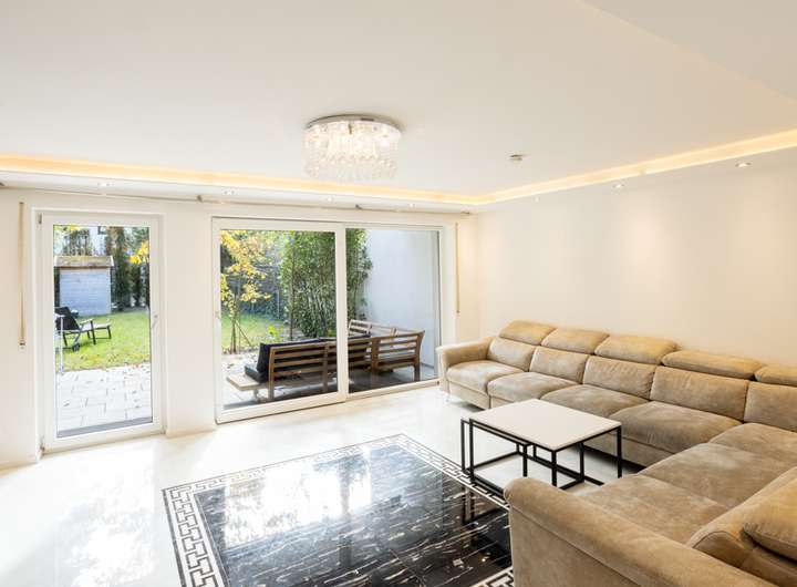 IM ERDGESCHOSS befindet sich der großzügige Wohn- und Essbereich mit moderner indirekter Beleuchtung, der viel Licht und Raum für individuelle Wohnideen bietet. Von hier aus gelangen Sie auf die große, nach Süden ausgerichtete Terrasse, die mit einer breiten Markise ausgestattet ist und einen schönen Blick in den gepflegten Garten bietet. Der Garten verfügt zudem über ein kleines Gartenhaus.