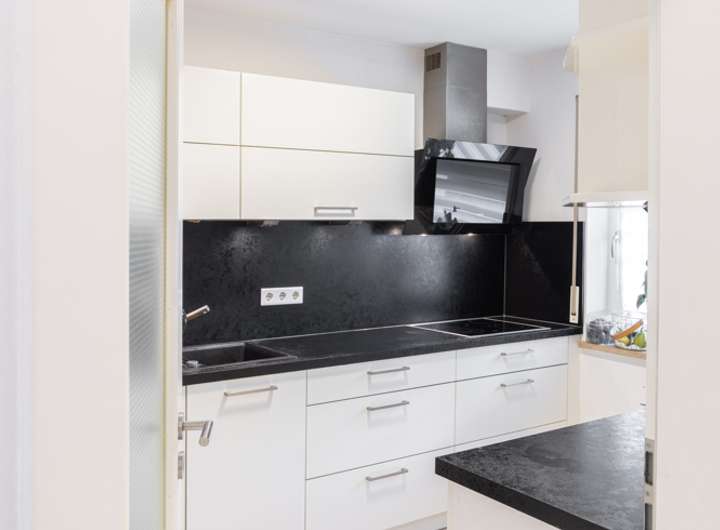 Die Küche ist mit einer modernen Einbauküche ausgestattet, die helle Fronten mit einer dunklen Arbeitsfläche kombiniert. Die funktionale Anordnung bietet ausreichend Stauraum in Ober- und Unterschränken und ermöglicht eine effiziente Nutzung der vorhandenen Fläche. Zur Ausstattung gehören unter anderem verschiedene Elektrogeräte sowie die üblichen Küchenelemente wie Spüle und Arbeitsbereiche, die den Alltag in der Küche angenehm unterstützen. Ein Fenster sorgt für Tageslicht und eine gute Belüftung. Insgesamt befindet sich die Küche in einem gepflegten Zustand und fügt sich stimmig in den Gesamtzustand des Hauses ein.