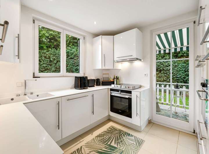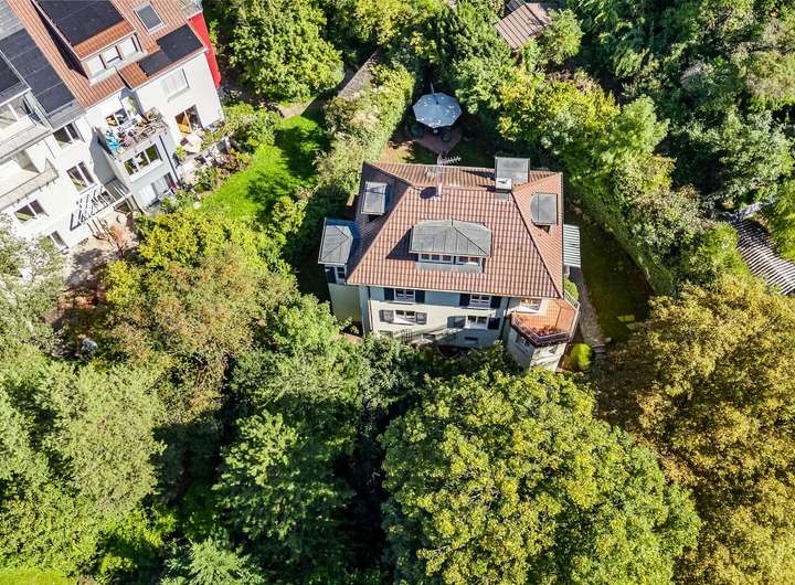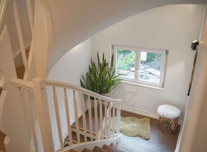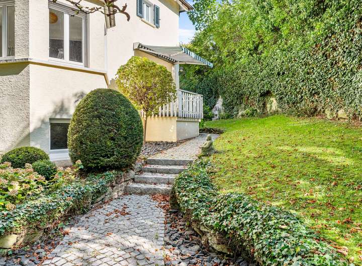 Der Zugang erfolgt über einen eigenen, von der Straße abgewandten Anliegerweg mit separater Zugangstreppe – ein weiterer Baustein für den außergewöhnlich privaten Charakter dieser Immobilie.